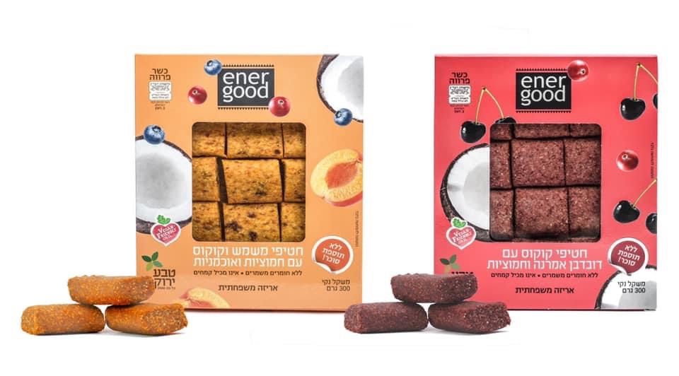 La empresa “Teva Iarok” ( חברת “טבע ירוק” ) presenta Ener Good: un paquete de bocaditos tamano familiar que son cuadrados energéticos con excelentes sabores a base de frutas secas, coco, cacao, cereza y arándanos; Damasco, coco y arándano.