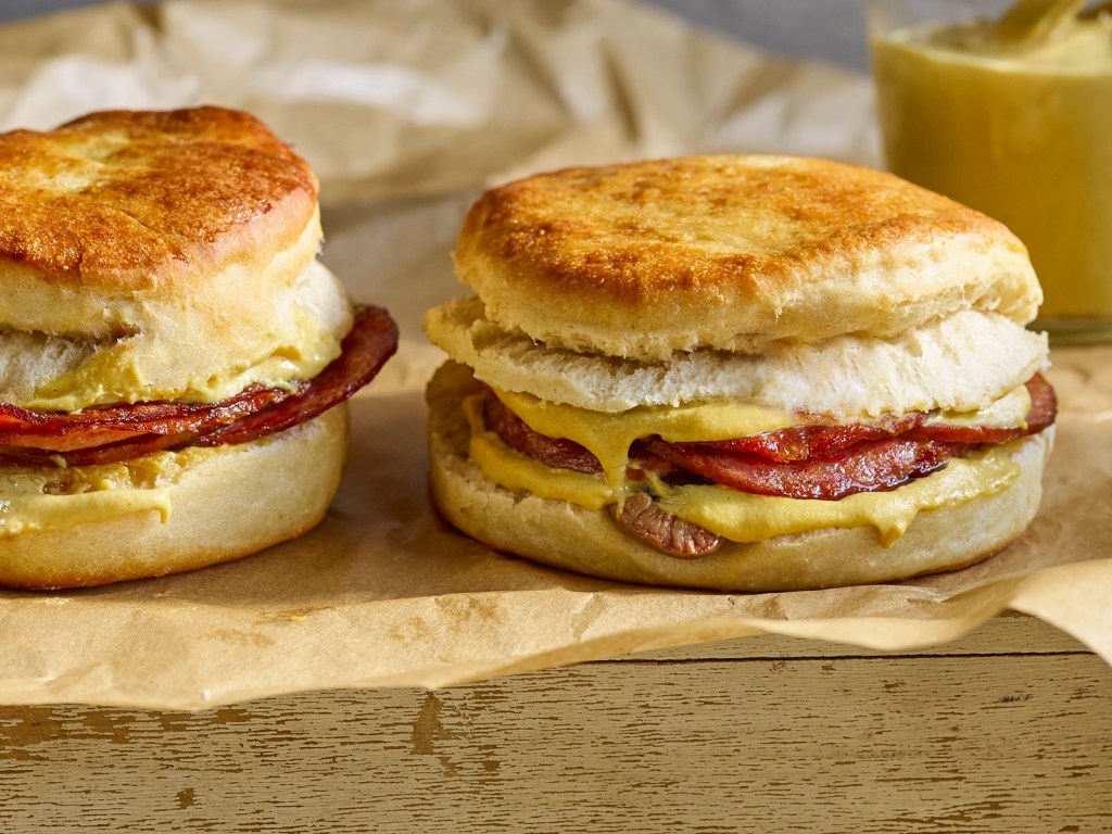 4. Corte los panes de lado y esparza mostaza / kétchup / mayonesa o los tres generosamente juntos en ambas partes del panecillo. Coloque el abanico de salami en el centro del panecillo de modo que los bordes del panecillo se unten con mostaza.