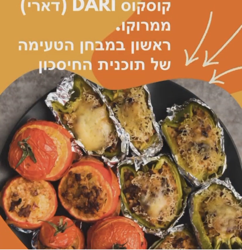 Hay una razón por la que el cuscús DARI ocupó el primer lugar en la prueba de sabor del programa de ahorro de Channel 12: simplemente, ¡porque realmente es el más delicioso! El cuscús es importado al país desde Marruecos por la empresa «Tomer», que se especializa en la importación y comercialización de productos alimenticios (desde 1983). En honor a la halagadora calificación, «Tomer» ofrece una gran receta de tomates y pimientos picantes, rellenos de delicioso cuscús, hierbas, zanahorias y cebollas fritas.