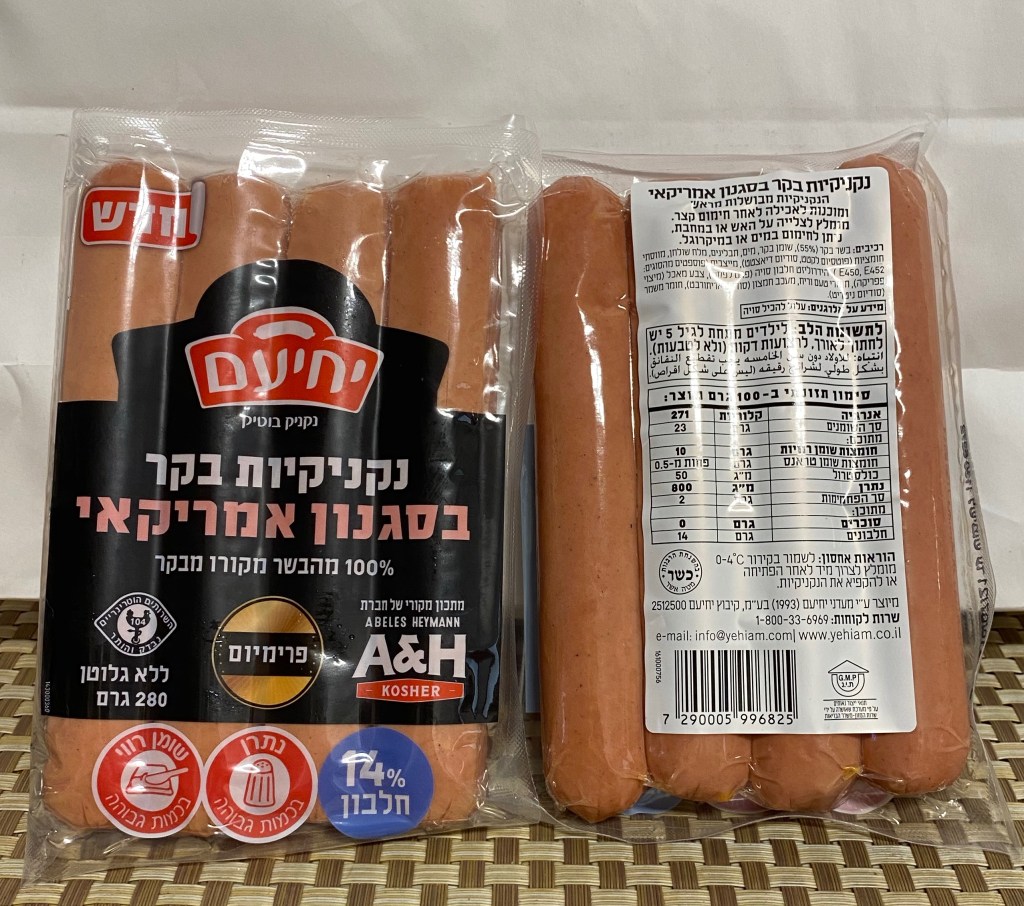 El fabricante de productos cárnicos «Maadanei Yehiam» está lanzando nuevas salchichas gourmet, salchichas de ternera al estilo americano. Las salchichas son 100% carne vacuna premium y se producen de acuerdo con receta y conocimiento de la subsidiaria de Yehiam Delicacies en los EE. UU., A&H. Todos los componentes de la carne en la receta son de carne de vacuno y tienen un sabor y textura únicos que son significativamente diferentes.Los embutidos de carne estilo americano estarán disponibles en las cadenas alimentarias de todo el país.