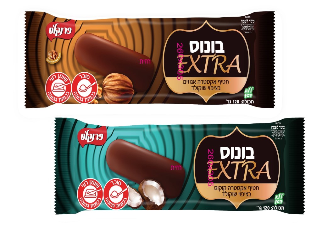 Serie «Bonus»: Galletas crujientes cubiertas de chocolate. En la serie: «Bonus plus – galletas recubiertas de chocolate» y «Bonus – galletas semicubiertas de chocolate». Peso del paquete: 300 g (contiene dos paquetes, para facilitar su uso y mantener la frescura). Precio: 21,90 – 24,90 NIS.