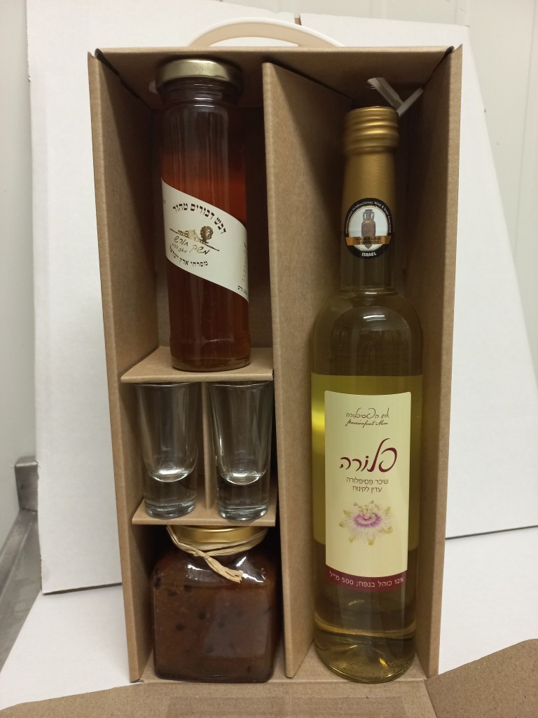 שי פישביין מציע לחגים מארז ייחודי הכולל בקבוקשיכר של פלורה של איש הפסיפלורה, 500 מ»ל, שיכר מבוסס פסיפלורה, ביחד עם שתי כוסות יין, ריבת פסיפלורה ודבש במחיר 160 ₪