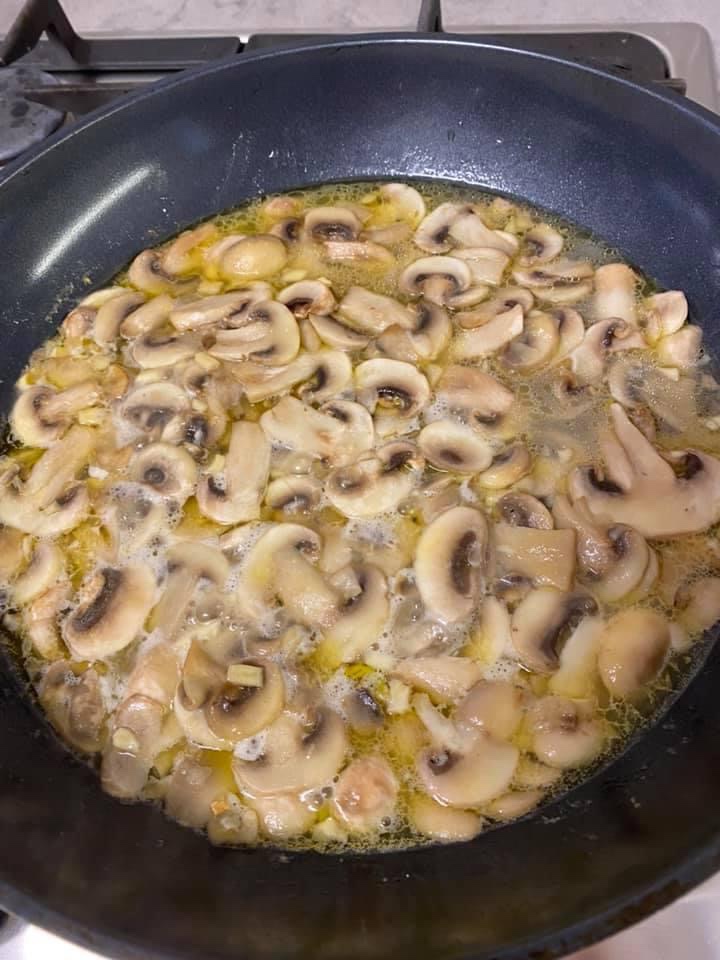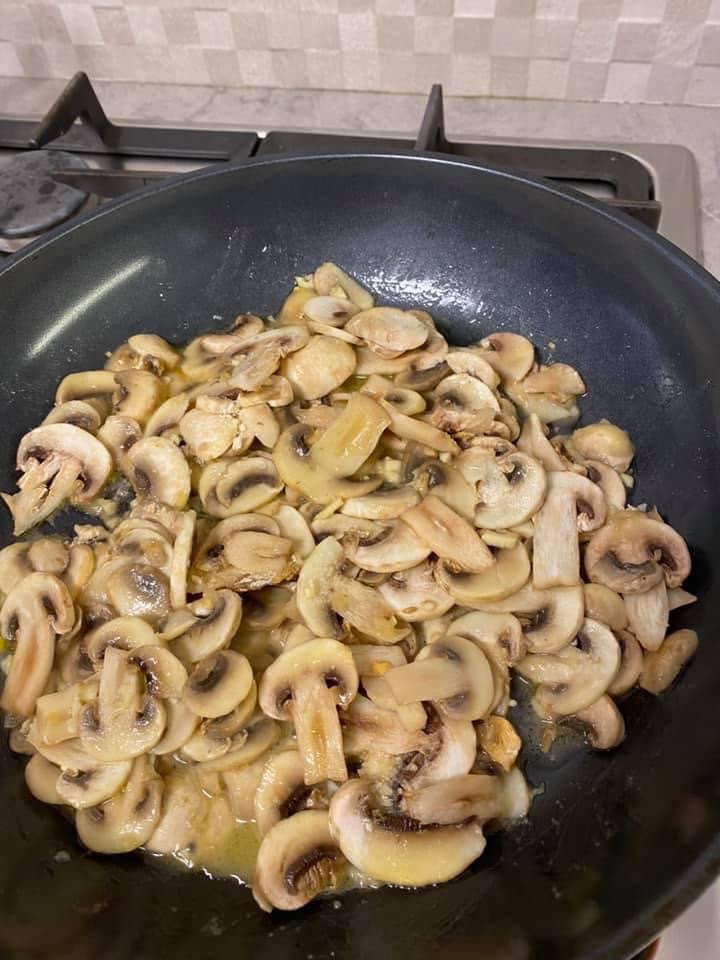 Colocar la manteca en una sartén y en fuego lento derretirla. Mientras tanto cortar los hongos y agregarlos a la manteca derretida. Apenas los hongos cambien de color agregar el ajo y luego el vino blanco. Hervir los ravioles de dos o tres minutos y agregarlos a la sartén de los hongos, seguir rehogando 2 minutos más para que tome el sabor de los hongos y del ajo. Servir en una fuente con el queso cortado con el pela papas para que queden tiras.