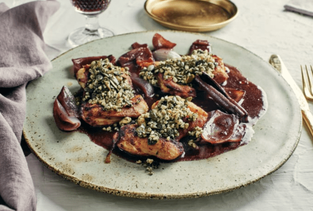Pollos al vino y costra de nueces