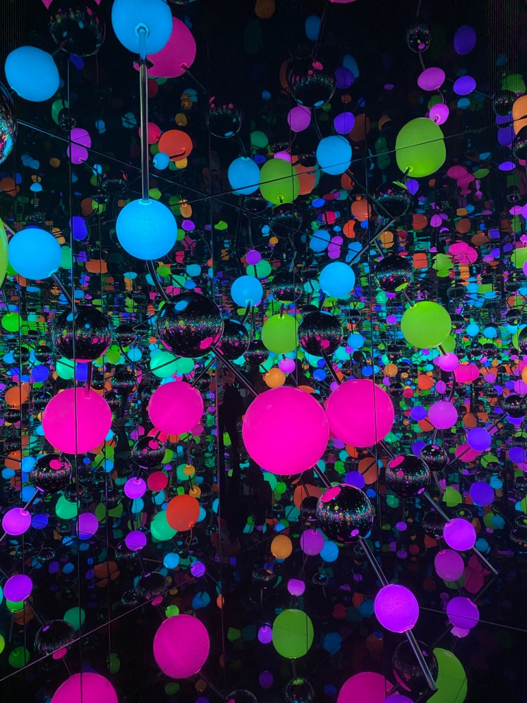 La retrospectiva del Museo de Arte de Tel Aviv combina obras creadas por Kusama durante unos ochenta años. Revisa extensamente su trabajo artístico hasta el momento y rastrea su trabajo en Japón, Estados Unidos y Europa, desde sus primeras pinturas y esculturas hasta «salas infinitas» que rodean al espectador por todos lados, deslumbrando e inundando los sentidos. El infinito y la auto-desaparición son temas centrales en su obra. Patrones obsesivos de puntos y cuadrículas cubren las superficies en un patrón repetitivo sin fin, y los espejos producen espacios vertiginosos que replican las miradas de los espectadores.