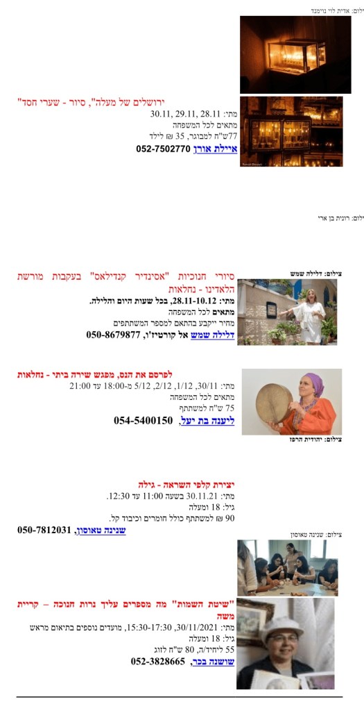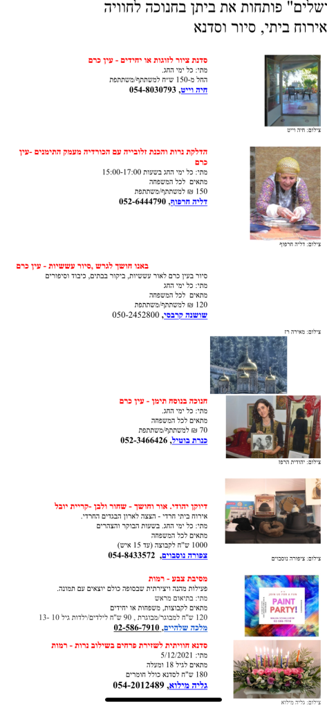 האירוח, הסיורים והסדנאות יתקיימו בהתאם להנחיות משרד הבריאות במועד הפעילות. ההשתתפות בתיאום מראש עם המארחות.