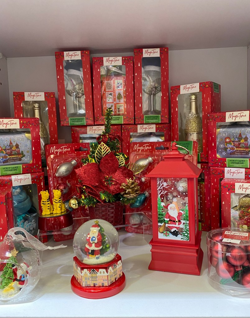 בין שלל המוצרים בולטים כל הקישוטים לעץ חג המולד כמו עצי אשוח בשלל גדלים כדורי בדולח , סוכריות , תוויות, פנסים אצטרובלים , בובות רווה מיוחדות עניבות ,משקפי סנטה קלאוס, כדורי שלג, שלטי סנטה מעץ, בובות קרמיקה לבושות בביגוד ההולם את החג, פנסי נעים עם סצנות חג המולד,ועוד…