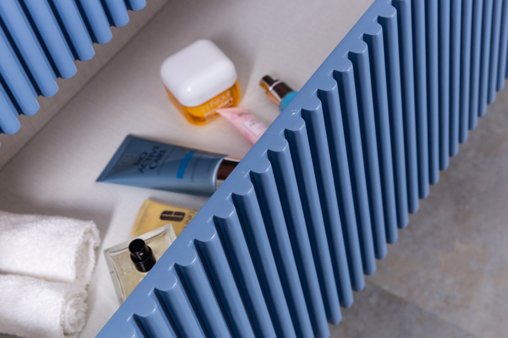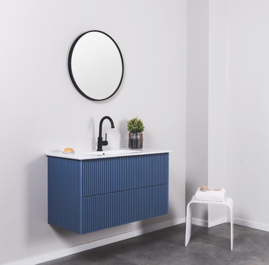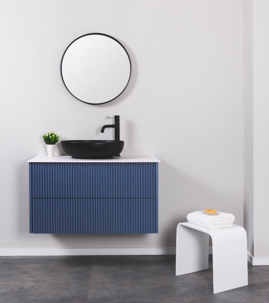 ארון אמבטיה מרהיב ביופיו, בעל 2 מגירות, עם לחיצת טאצ’ ללא צורך בידיות, בצבע כחול פסיפיק משגע • דגם ארון מוניקה הינו חלק מ’הטרנד המחורץ’שכבר ניתן לראות בפריטי ריהוט רבים ברחבי הבית