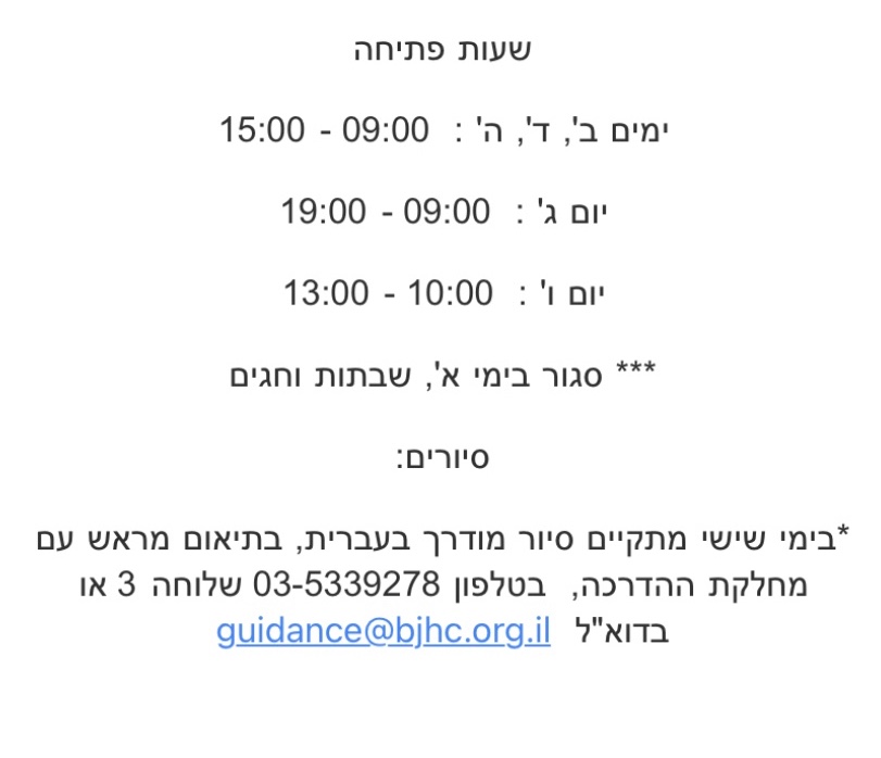 *בימי שישי מתקיים סיור מודרך בעברית, בתיאום מראש עם מחלקת ההדרכה, בטלפון 03-5339278 שלוחה 3 או בדוא»ל guidance@bjhc.org.il