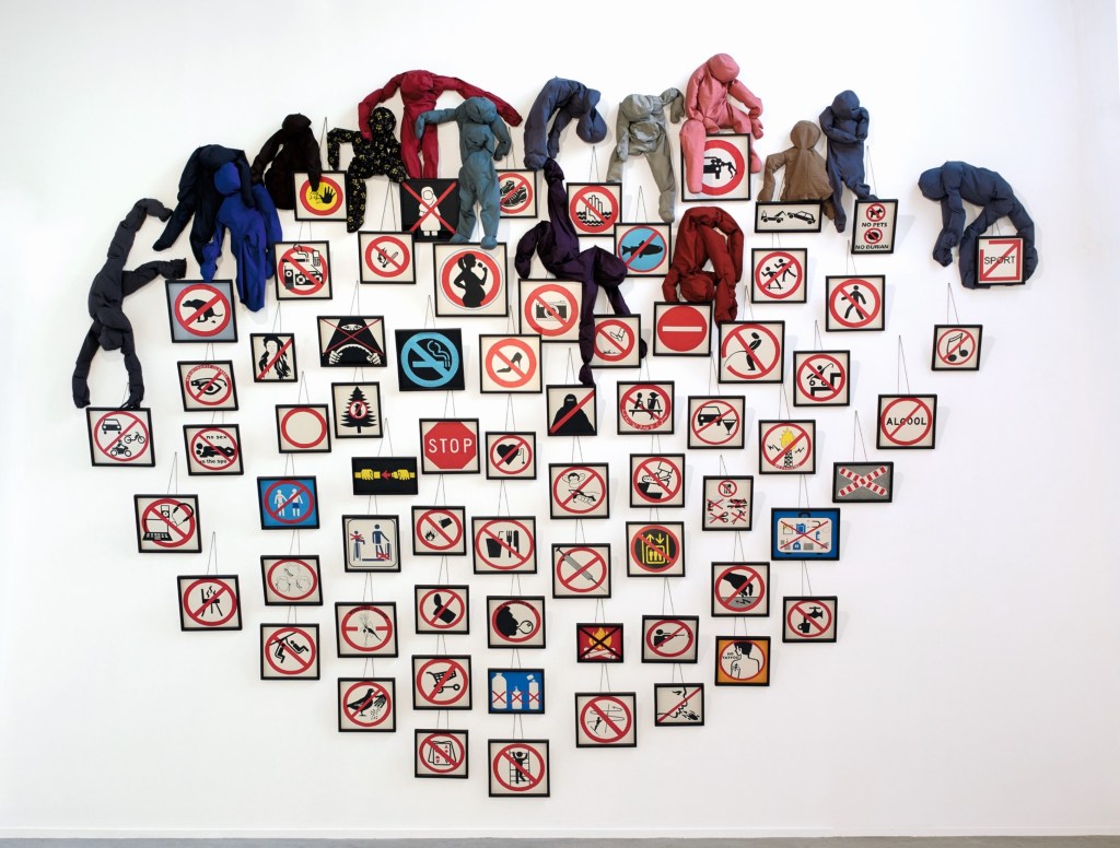 The Interdictions in 2014, 2014, 69 framed drawings, colored pencils, 15 soft elements, fabric,