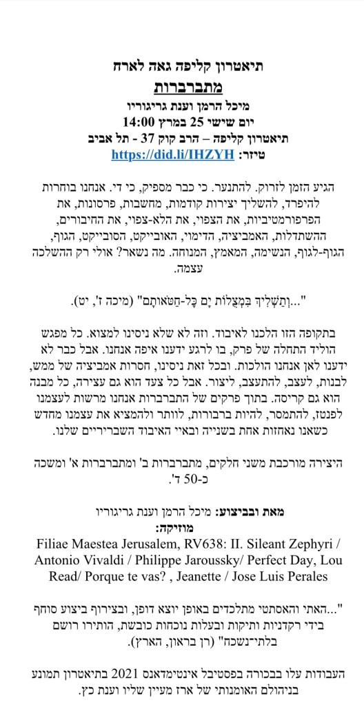מיקום: תיאטרון קליפה- הרב קוק 37 – תל אביב