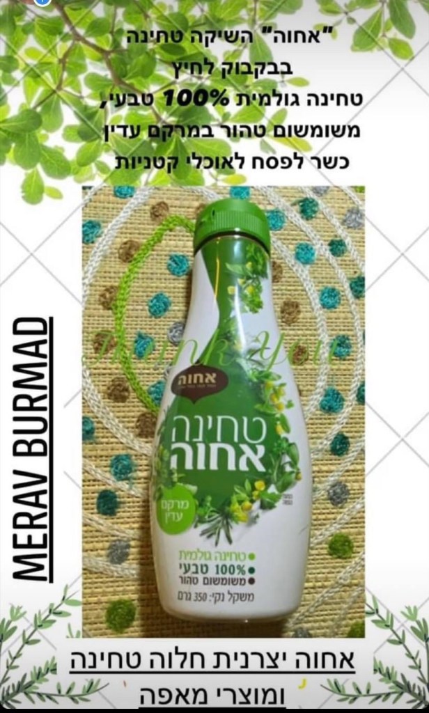 El tahini de Achva, fabricante líder en Israel de tahini, jalá y pasteles, lanza en un envase de botella de plástico. De diseño moderno y cómodo, tiene un panel lateral transparente para verificar la cantidad que queda en la botella, de un sabor maravilloso y delicado.