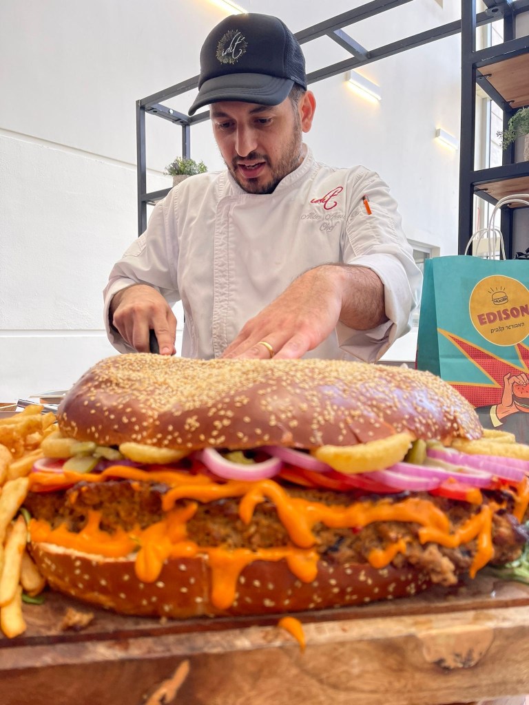 לקראת יום ההמבורגר הבינלאומי שיחול ב-28 למאי הכין אלון אזולאי השף הראשי של חב’ ההסעדה «עידית»מקבוצת מלונות דן שמנהלת גם רשת המבורגרים למקומות העבודה (רשת «EDISON») , את המבורגר הגדול ביותר בישראל המבורגר בקוטר של 70 ס»מ במשקל של 16 ק»ג מבשר איכותי של שפונדרה, אסאדו, צלעות ושומן עם כל התוספות המומלצות : ביצת עין, בצל מטוגן, פטריות מוקפצות, חלפיניו, אננס צלוי, שום קונפי, ירקות טריים, והכל בתוך לחמנייה בריוש טרייהבקוטר 75 ס»מ