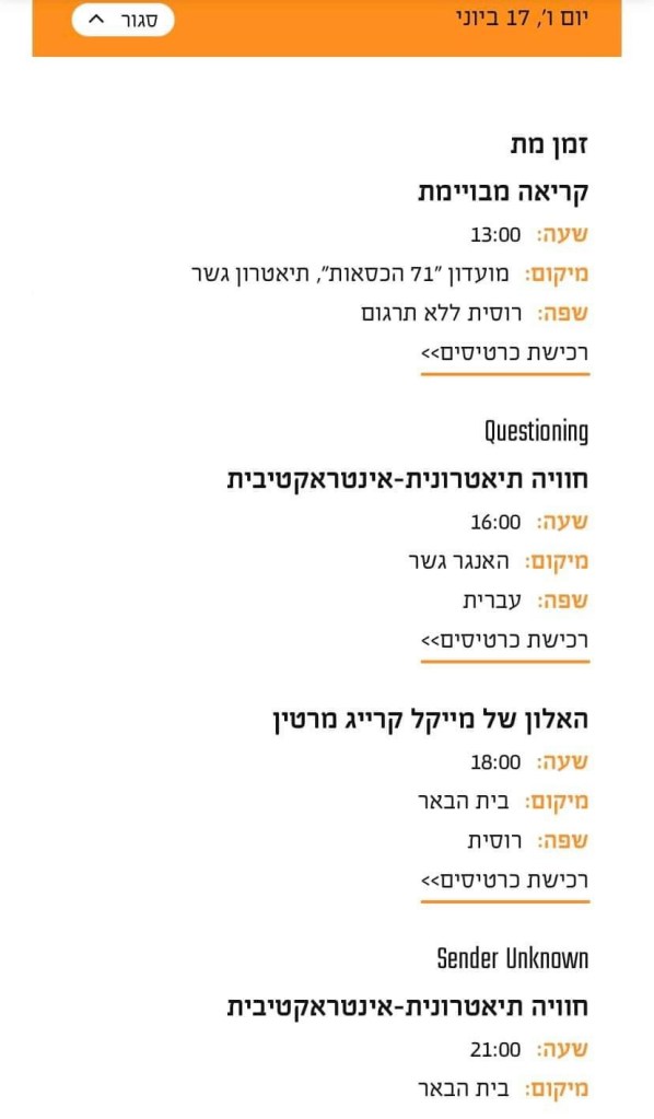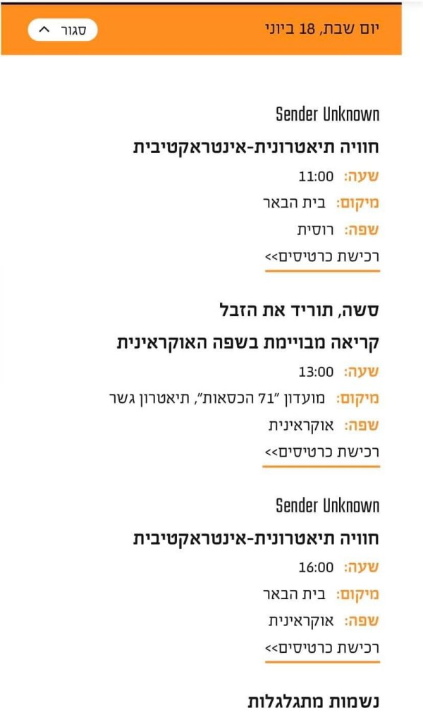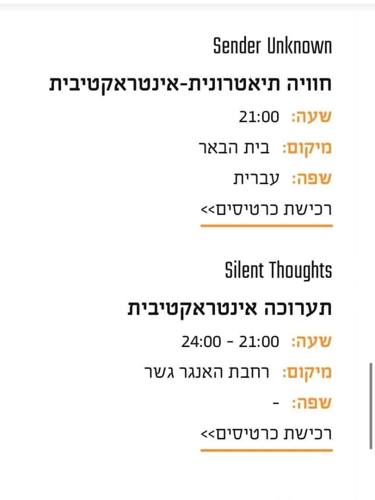 Remitente desconocido: una habitación vacía, un paquete de una dirección desconocida y un reproductor de CD. Un espectáculo de rompecabezas interactivo que llevará al público a una aventura misteriosa. Este sorprendente proyecto, que se presentará en Beit HaBar (Derech Shlomo 6, cerca de los patios de Jaffa), nació de una larga serie de investigaciones y encuestas realizadas en tres ciudades diferentes: Bishkek (Kirguistán), Kherson (Ucrania) y Colonia, (Alemania). El público interactuará de forma única con las personas que participaron en el estudio, es decir, con su reflejo en diversos objetos, cuando no se conoce con antelación el final del recorrido. La obra se representará cuatro veces durante el festival en cuatro idiomas diferentes: inglés, ruso, ucraniano y hebreo.