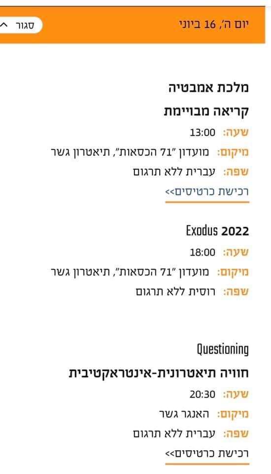 Además, habrá tres lecturas escénicas en tres idiomas: hebreo, ucraniano y ruso de importantes obras contra la guerra interpretadas por actores inmigrantes y jóvenes actores del «Studio Gesher». Las obras son: «La reina del baño» de Hanoch Levin, «Sasha, baja la basura» de Natalia Verzhabit, «Tempus Mortuus (Dead Time)» de un grupo anónimo de creadores.