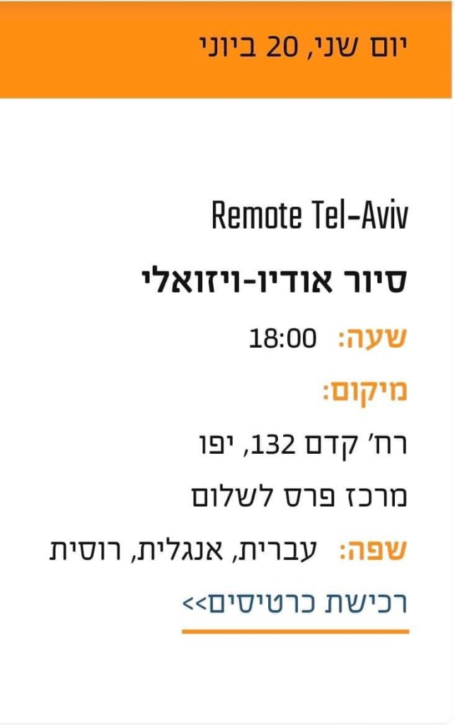 Remote Tel Aviv – El estreno en Tel Aviv de Remote X de Rimini Protokoll encargado por MART Festival. Desde el estreno de Remote Berlin en 2013, el proyecto se ha basado en un recorrido audiovisual por más de 50 ciudades de todo el mundo, incluidas Lisboa, Madrid, Nueva York, Sao Paulo y más. Finalmente, también vendrá a Tel Aviv.