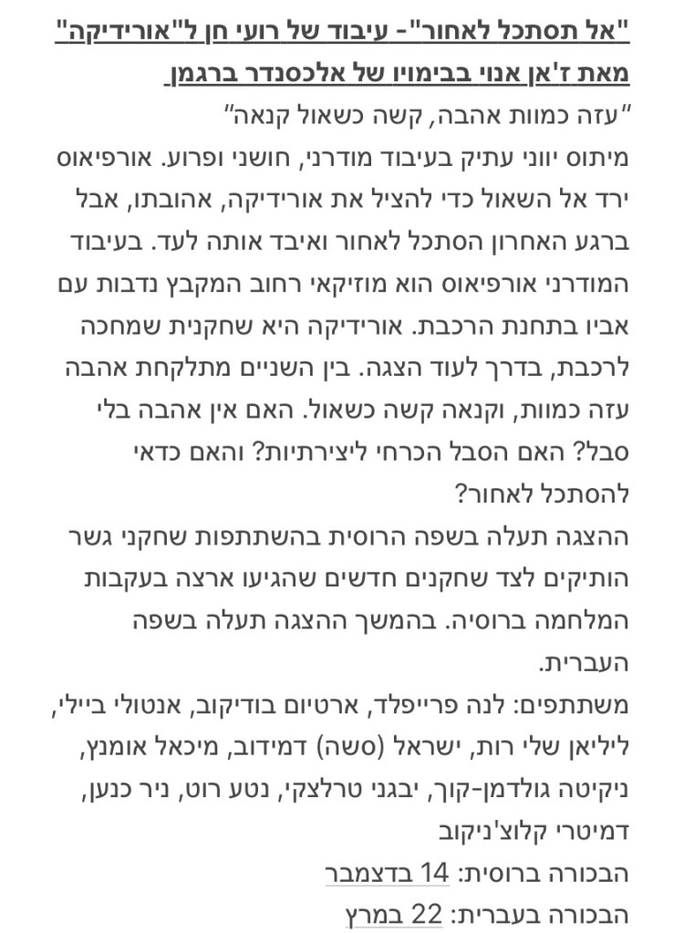 פרויקט מיוחד שיעלה על במת גשר – «אל תסתכל לאחור», עיבוד של רועי חן ל»אורידיקה» מאת ז’אן אנוי. ההצגה תעלה תחילה בשפה הרוסית ובה ישתתפו שחקני גשר לצד שחקנים שעלו ארצה לאחרונה בעקבות המלחמה באוקראינה. בהמשך השנה תעלה ההצגה בשפה העברית
