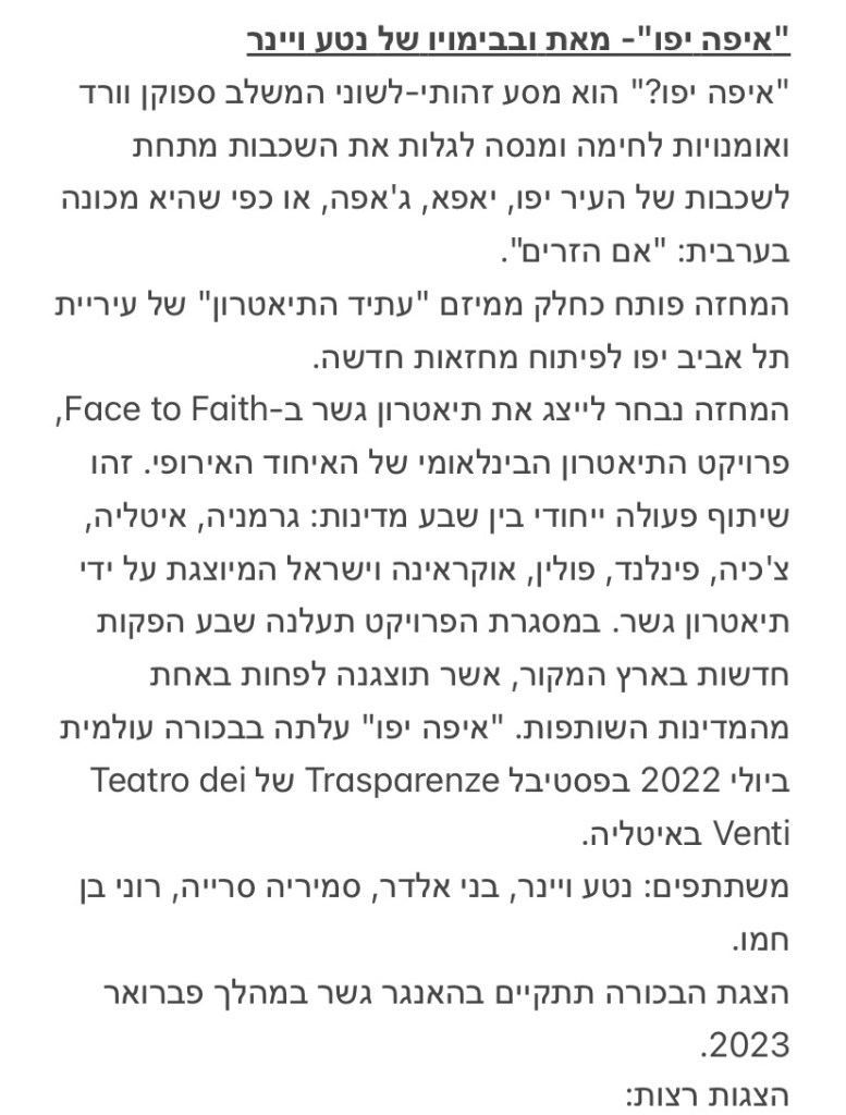 כחלק ממיזם «עתיד התיאטרון» של עיריית תל אביב-יפו לטיפוח מחזאים צעירים, יעלה המחזה «איפה יפו» מאת נטע ויינר