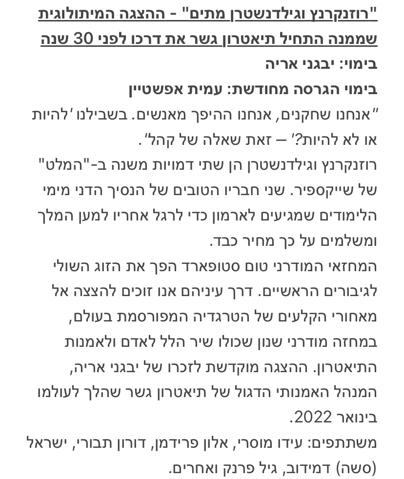 לזכרו של יבגני אריה תיאטרון גשר העלה מחדש את ההצגה המיתולוגית ‘רוזנקרנץ וגילדנשטרן מתים» – ההצגה הראשונה שהועלתה בתיאטרון גשר לפני כ-30 שנה, בבימויו של יבגני אריה. הגרסה הנוכחית בבימויו של עמית אפשטיין