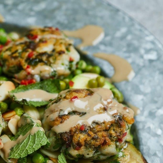 קבב דג עם אפונה קישואים וטחינה של «אחוה» (צילום: שניר סופגי גואטה