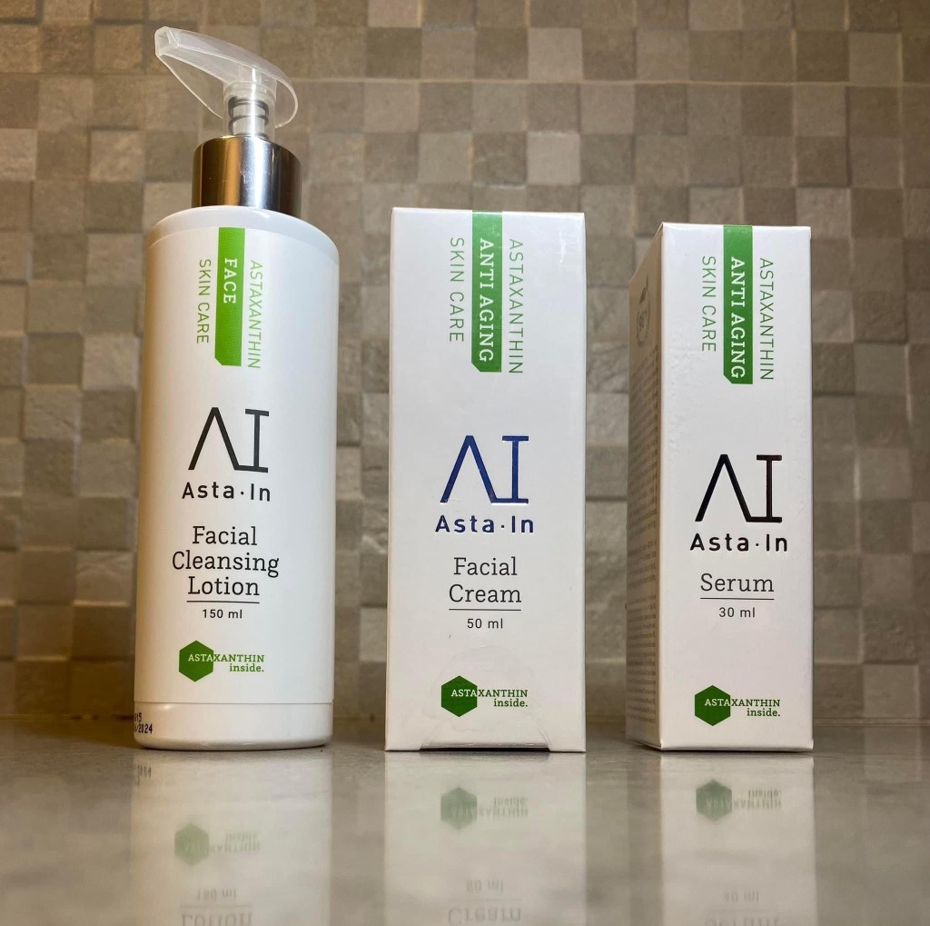 La serie de productos cosméticos Asta-in fue desarrollada para brindar una solución natural y perfecta para el cuidado de la piel del rostro. La serie incluye una loción de limpieza profunda, una mascarilla de arcilla reparadora, un suero y una crema facial enriquecidos con astaxantina: