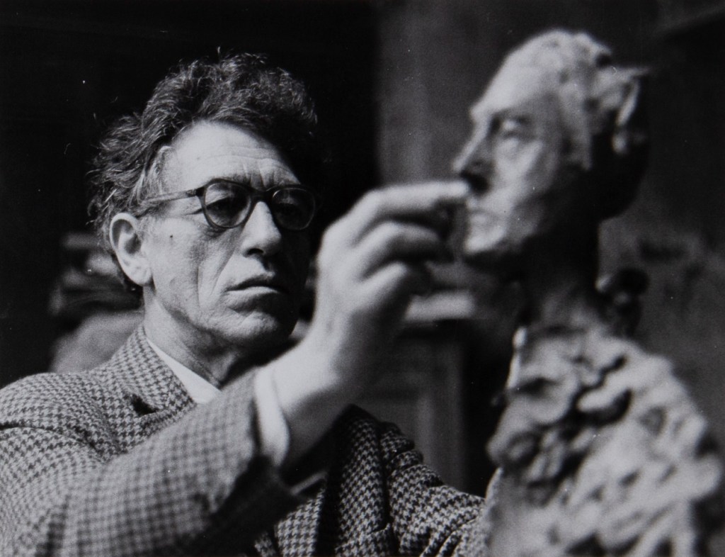 Giacometti is best known for his painted portraits and distinctive sculptures created after World War II, including a series of elongated standing women, walking men, and expressive busts, which emerged at a time when many were grappling with feelings of postwar anxiety and a renewed interest in human nature. Giacometti’s body of work reflects his investigations of the human figure and his repeated attempts to capture his experience of seeing, what he called «rendering my vision.»