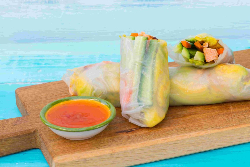 4. Prepare las hojas de arroz según las instrucciones del fabricante. Enrolle un par de hojas y en su interior tiras de verduras, trozos de salmón y rodajas de aguacate.
