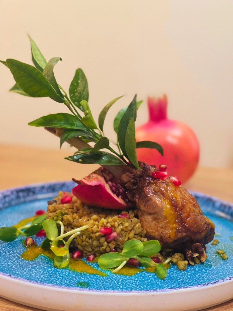 5. Para servir: coloque el friki en un plato y encima la pata de ganso y decore con semillas de granada.