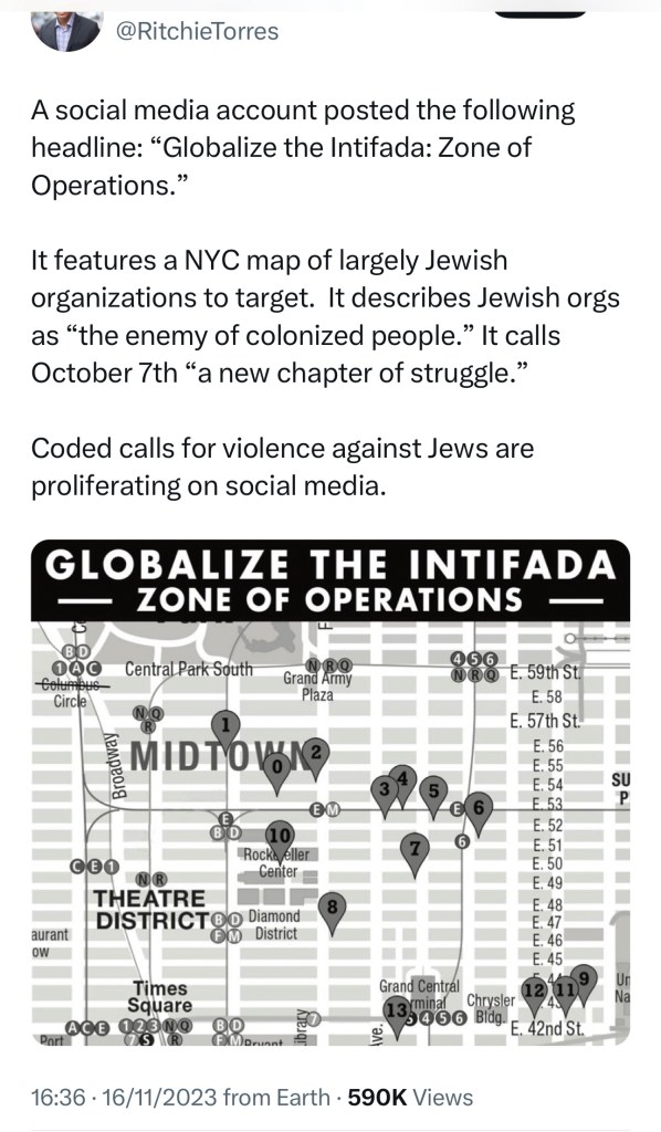 «Los llamados codificados a la violencia contra los judíos están proliferando en las redes sociales», dijo el representante Ritchie Torres, demócrata por Nueva York. escribió en X.