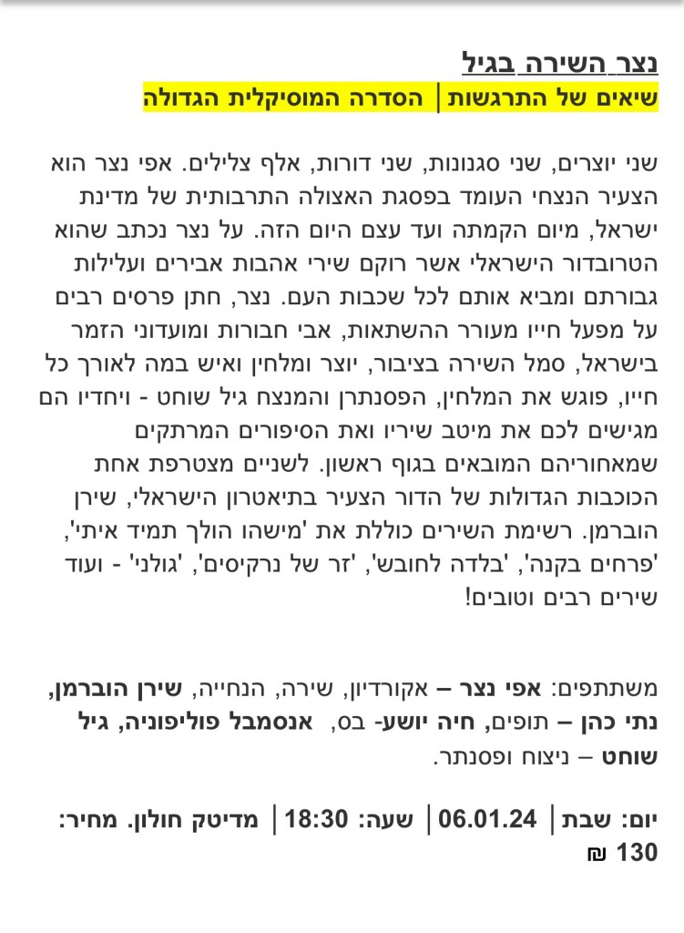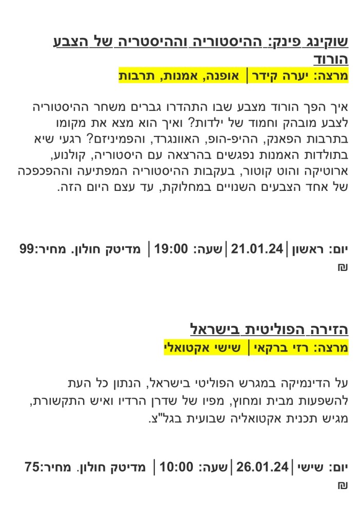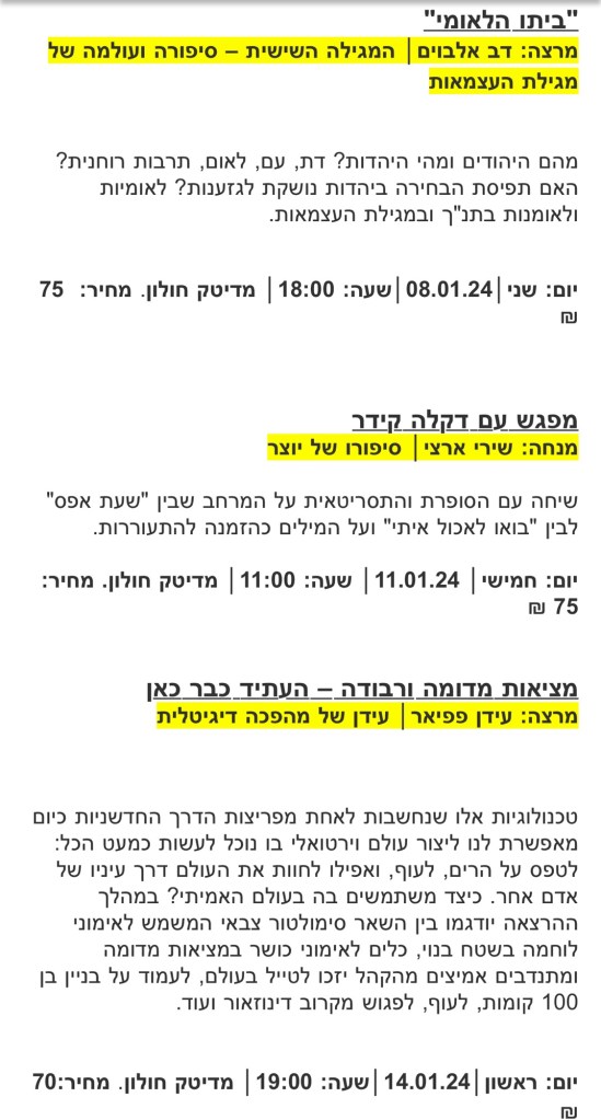 בין ההרצאות והמפגשים בחודש ינואר 2024: מפגש עם דקלה קידר בהנחיית שירי ארצי, ‘שוקינג פינק: ההיסטוריה וההיסטריה של הצבע הורוד’ בהנחיית יערה קידר, מופע חדש ומפתיע של הסדרה המוסיקלית ‘שיאים של התרגשות’ בהשתתפות גיל שוחט, אפי נצר ושירן הוברמן, ‘הזירה הפוליטית בישראל’ בהנחיית רזי ברקאי, ‘ מציאות מדומה ורבודה – העתיד כבר כאן’ בהנחיית עידן פפיאר ו’ביתו הלאומי – סיפור עולמה של מגילת העצמאות’ בהנחיית דב אלבוים.