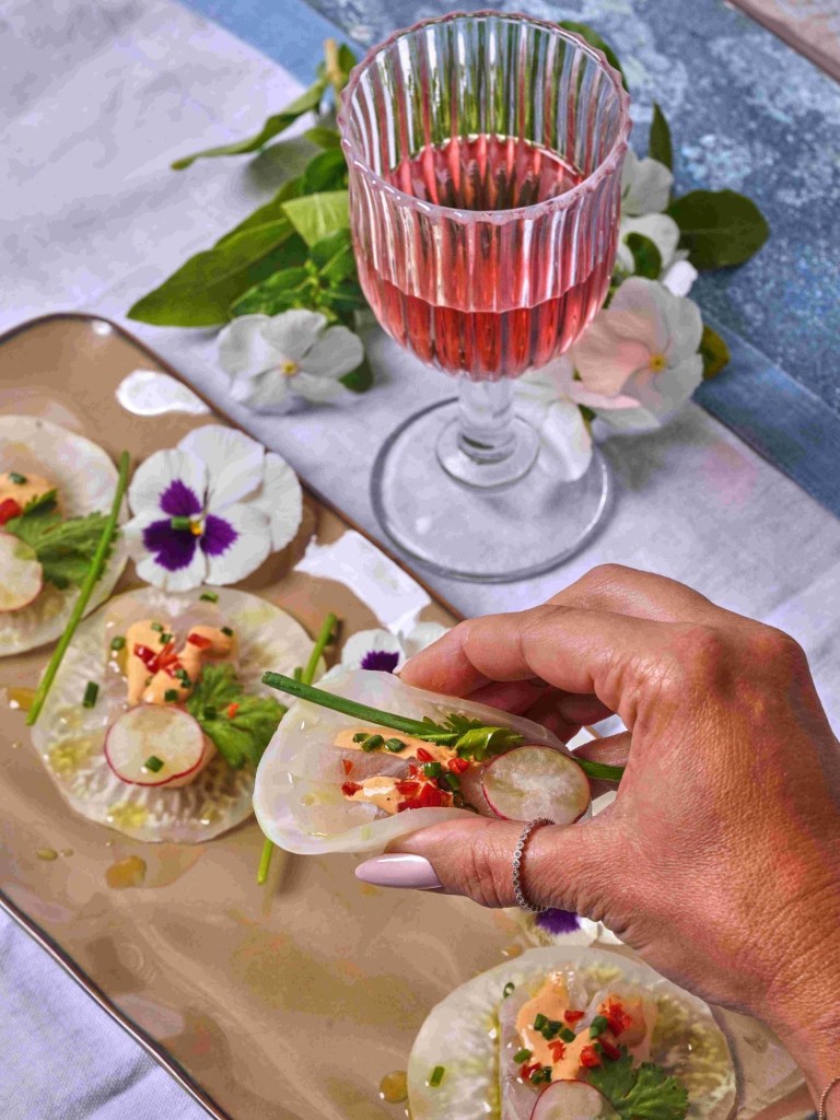 Tahina «Turkiz» y la chef Leli Haas nos regalan una receta decorada: Sashimi intias con carpaccio de colores y tahini de chile picante.