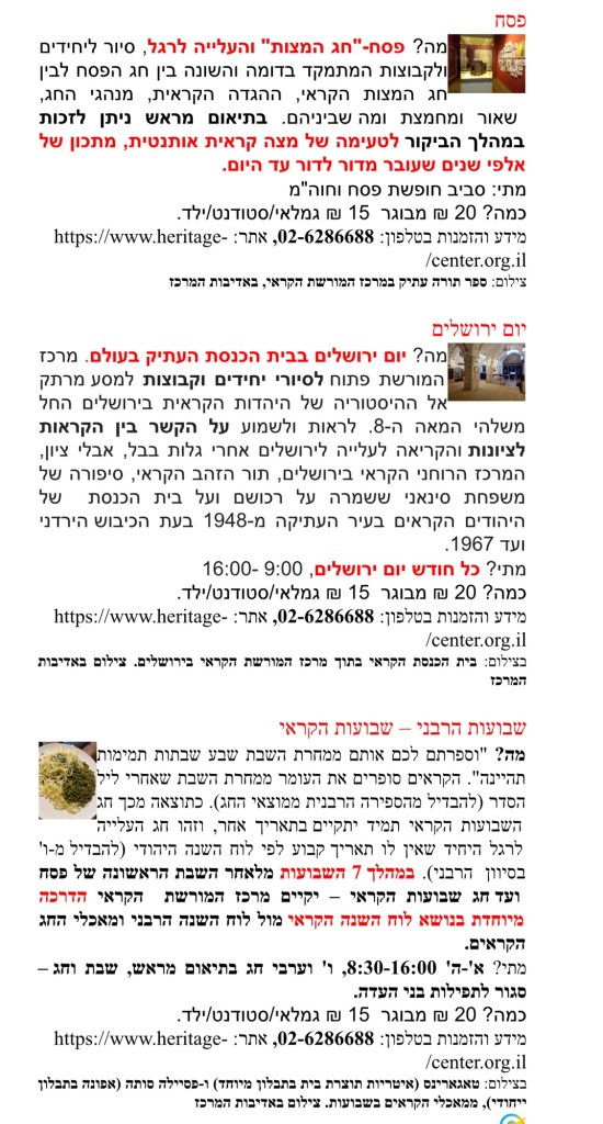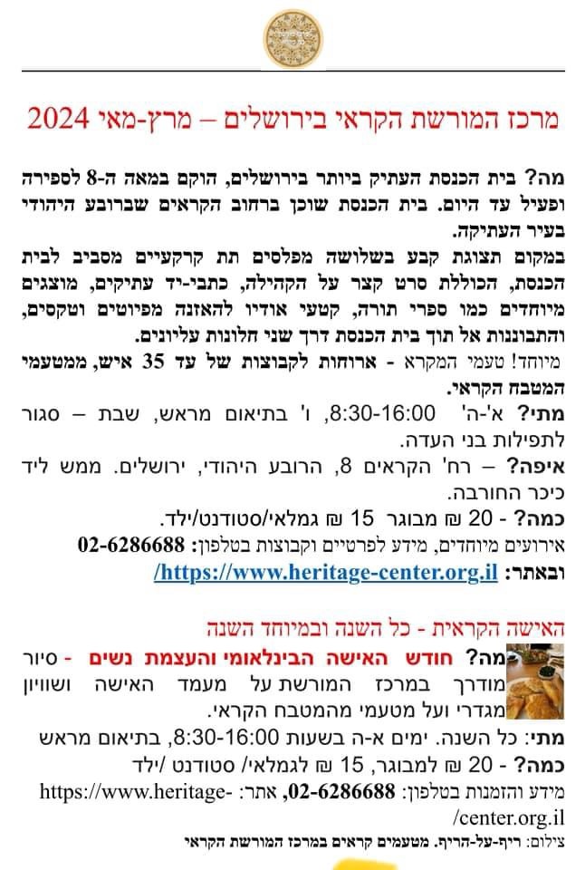 באופטימיות זהירה חוזרים לתכנן טיפה קדימה, והפעם – מידע על פעילויות מרכז המורשת הקראי בירושלים לחודשים אפריל – מאי