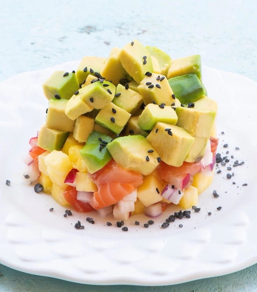 La combinación de los sabores del salmón con las frutas y el aguacate crean un platillo de ensueño y delicioso. La receta es fácil de preparar y adecuada como primer plato en una comida festiva.