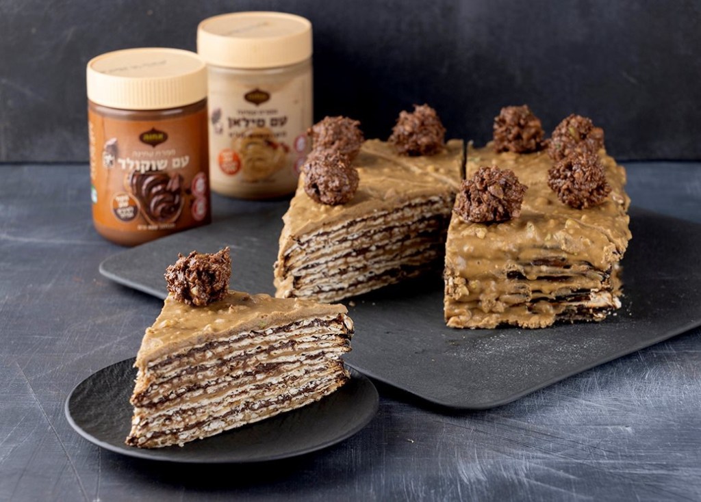 4. En la última capa, agregue una mezcla de nueces picadas al tahini untado con silano y extienda sobre la matzá superior.