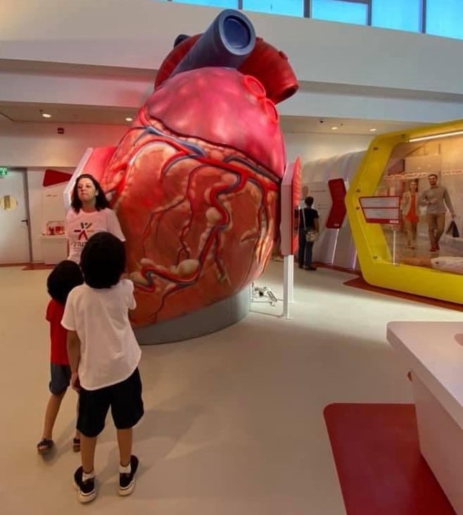 בתערוכת הלב תיכנסו לתוך לב ענק, ותגלו כמה קשה הוא עובד, תשמעו סרטון ותוכלו לעמוד ליד לב ענקי הנישא לגובה של 5 מטרים. בתערוכת הלב מגלים כמה קשה הוא עובד. מגלים, ע»י הפעלת המוצגים כיצד יודע הלב מתי לפעום? כמה פעימות הלב של כל אחד פעם עד היום, של מי פועם הלב מהר יותר, של נשים או של גברים ? גם נכנסים לחדר ניתוח אינטראקטיבי, והופכים לקרדיולוגים. בחדר צנתורים מצילים סימולטור אנושי מהתקף לב ומתנסים במכשיר האולטרסאונד. משם תמשיכו לתערוכת «הידעת?» ותגלו את נפלאות גוף האדם והטכנולוגיות הרפואיות החדשניות, עומדים ממול מודל של עין ענקית ומגלים, שאנחנו רואים הפוך. איך אפשר לייצר הבעות פנים? איך המיקרוסקופ מאפשר לראות את העור בהגדלה, כמו שעין רגילה לא יכולה לראות? ותסיימו בתערוכת הריאות תמדדו, בין השאר, את כמות החמצן בדם. שם מפעילים מוצג הממחיש את הצורך בסרעפת, מגלים מה מייחד את הנשימה של הכבאי, של מטפס הרים, או של עובר ברחם. גם מתנסים בשימוש בסטטוסקופ בסימולטור אנושי בחדר ניתוח, ולבסוף, מצילים חיים בהנשמה מלאכותית של סימולטור נחנק