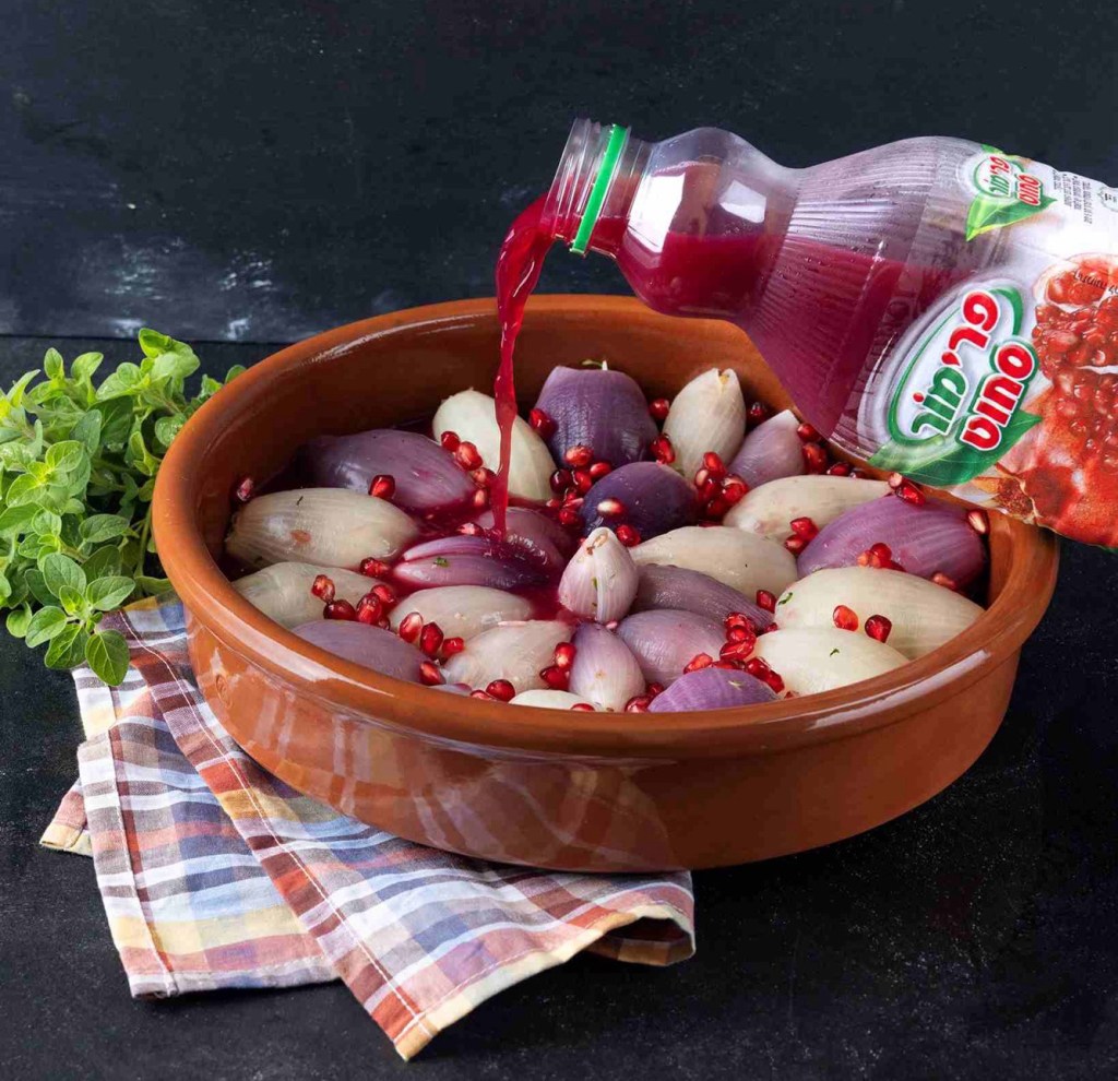 Cebollas rellenas con salsa de jugo de granada