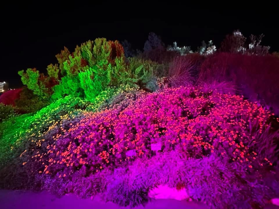 Entre las instalaciones más memorables destacaba un delfín gigante de luz que parecía flotar sobre el agua, reflejando formas geométricas cambiantes en tonos azules y dorados. También me cautivó una sección donde cientos de flores de luz LED, colocadas cuidadosamente entre las plantas reales, creaban la ilusión de un jardín encantado de múltiples colores.