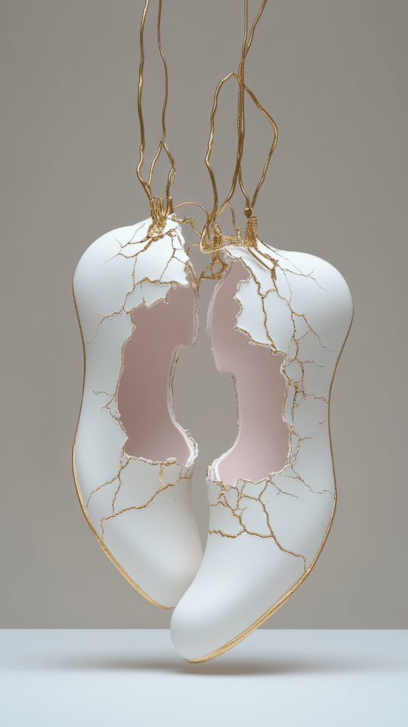 ז’קטים מחוררים בכדורים עשויים פורצלן, מחוכים עדינים שנשברו, נעלי ריקוד תלויות באוויר. עדות שקטה לאובדן, למאבק, ולרצון להמשיך לנוע.
