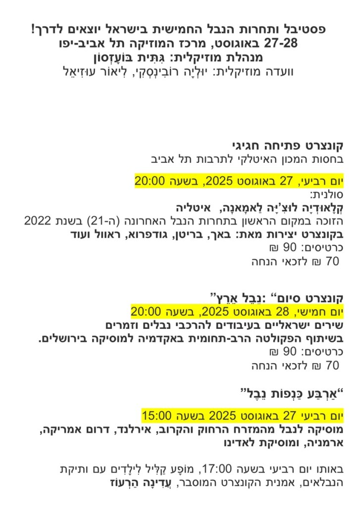 פסטיבל ותחרות הנבל הישראלית החמישית, ה»אחות הקטנה» של תחרות הנבל הבינלאומית בישראל יתקיימו בין ה27-28 באוגוסטבמרכז המוזיקה בתל אביב יפו. בפסטיבל יתקיימו קונצרטים ייחודים בניהולה האמנותי של גתית בועזסון