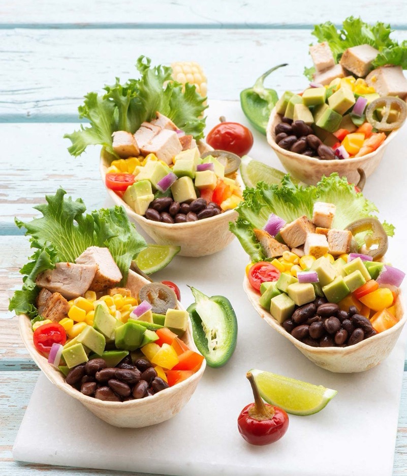 Precalentar el horno a 180 °C. Colocar las tortillas en pequeños cuencos resistentes al calor, ponerlos sobre una bandeja y hornear unos 10 minutos hasta que tomen forma. Retirar y dejar enfriar. En un bol, mezclar el aceite de oliva, el pimentón, la sal y la pimienta. Añadir las pechugas de pollo y cubrir bien. Cocinar el pollo en una sartén grill o plancha durante unos 5 minutos por cada lado, hasta que esté dorado y jugoso. Retirar, dejar enfriar y cortar en cubitos. Armar los tacos: colocar una hoja de lechuga sobre cada tortilla, añadir pollo, aguacate en cubitos, maíz, pimiento, tomates cherry, frijoles y cebolla morada. Servir con un buen chorro de lima fresca y jalapeños al gusto.