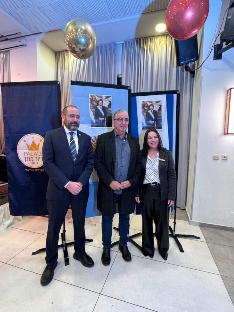 El evento de homenaje al presidente de Argentina, Javier Milei, se llevó a cabo el jueves 08/01, con la participación del embajador de Argentina en Israel, el Sr. Axel Shimon Wahnish, y del alcalde de Ra’anana, Haim Broida.