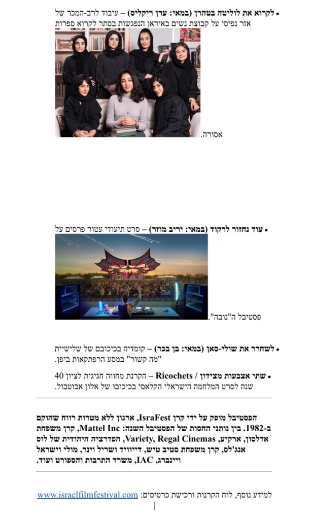 הפסטיבל אותו ייסד ומנהל מאיר פניגשטיין (פוגי), במטרה לקדם יצירה קולנועית ישראלית בארה»ב, יתקיים עד 19 בפברואר 2026. יוקרנו בו בבכורה בלוס אנג’לס, סרטים עלילתיים ודוקומנטריים ישראליים בולטים מהשנה האחרונה, מחווה לשחקן אלון אבוטבול ומפגשים עם אנשי קולנוע ישראלים אורחי הפסטיבל, ביניהם: יוסף אבו-מדגם, שי אביבי, דורון אלמוג, שרון אנגלהרט, רועי אסף, עידו בהט, מיכל ברזיס, הילה סעדה, אתי ציקו, דני רוזנברג ועוד רבים
