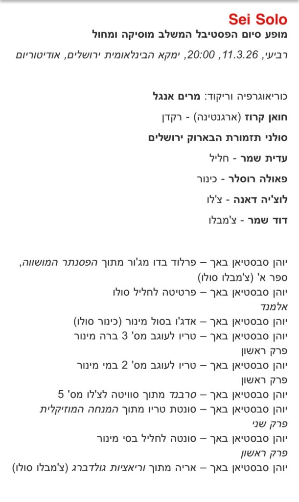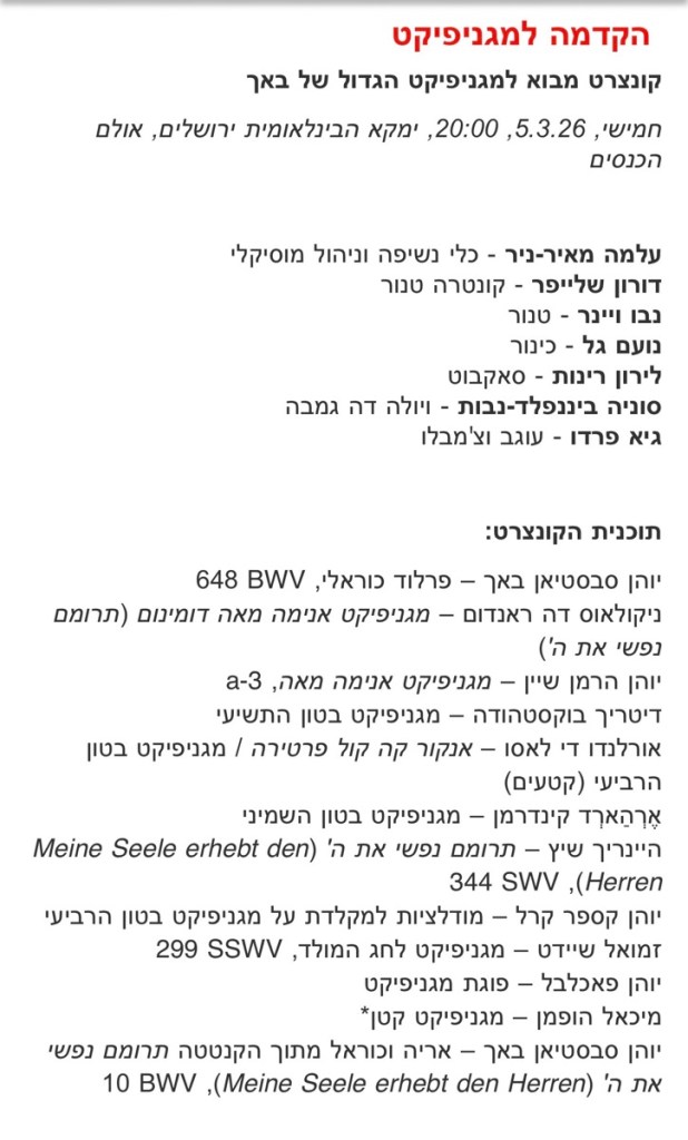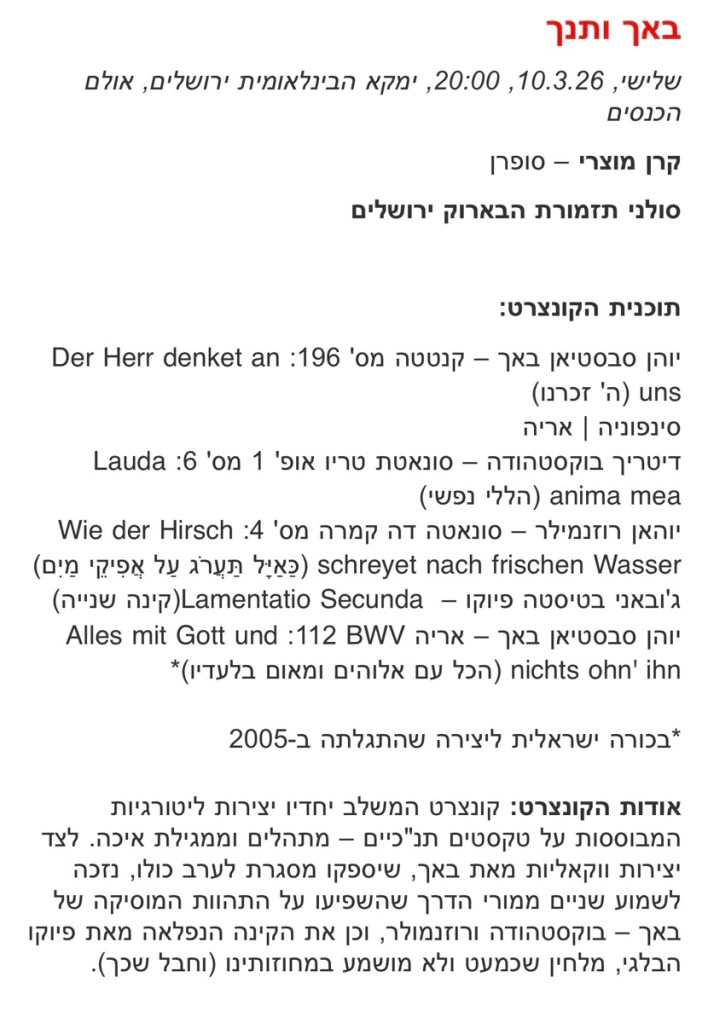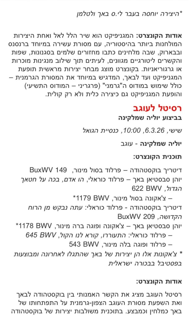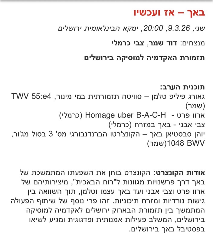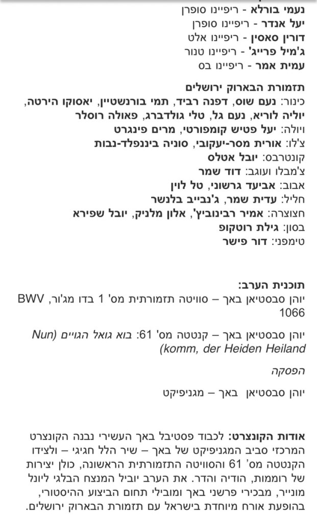 תזמורת הבארוק ירושלים גאה להציג: פסטיבל באך העשירי פסטיבל המוזיקה היחיד בישראל לציון יום הולדתו של באך5-11 במרץ 2026 ירושלים · תל אביב · חיפה