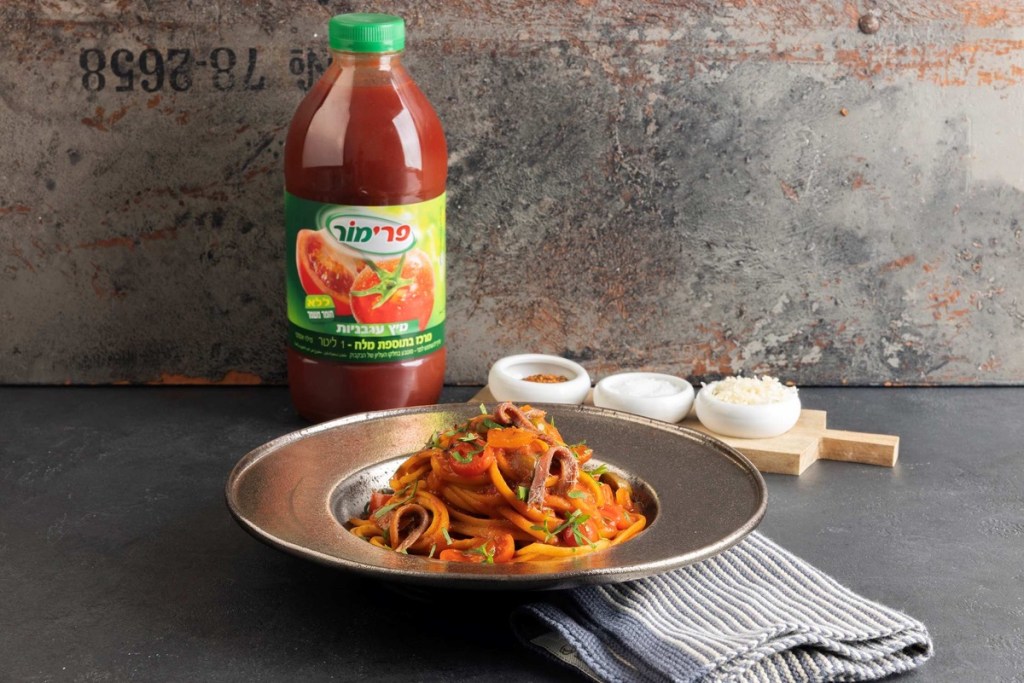 En una sartén caliente, a fuego alto, sofreír la cebolla en el aceite de oliva. Añadir los filetes de anchoa y mezclar hasta que se deshagan. Incorporar el ajo laminado y remover. Añadir el zumo de tomate y la guindilla, llevar a ebullición y cocinar a fuego alto durante unos 5 minutos. Agregar el resto de los ingredientes: tomates, alcaparras y aceitunas, y cocinar un minuto más. Incorporar la pasta cocida y mezclar bien con la salsa durante aproximadamente un minuto. Servir en un plato hondo y decorar con perejil picado y filetes de anchoa.