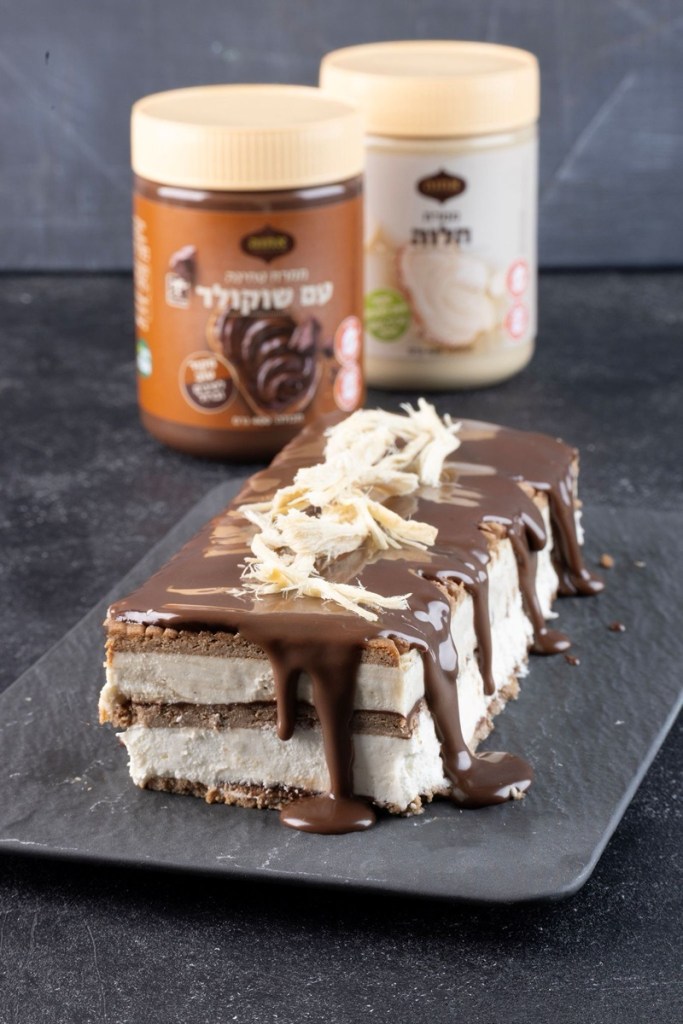 Base: Sumergir ligeramente las galletas en la leche o en el espresso y colocarlas en el fondo del molde formando una capa. Crema de tahina y chocolate: Batir 250 ml de nata con 2 cucharadas de crema de tahina con chocolate, 1 cucharada de pudín instantáneo de vainilla y 1 cucharada de azúcar glas hasta obtener una crema firme. Verter sobre la capa de galletas y alisar. Colocar otra capa de galletas ligeramente humedecidas sobre la crema. Crema de halva: Batir los otros 250 ml de nata con 2 cucharadas de crema de halva, 1 cucharada de pudín instantáneo de vainilla y 1 cucharada de azúcar glas hasta obtener una crema firme. Verter sobre la segunda capa de galletas y alisar. Llevar al congelador durante al menos 4 horas, preferiblemente toda la noche. Cobertura: Derretir el chocolate junto con la nata hasta obtener una ganache lisa y brillante. Verter sobre la tarta aún congelada. Decorar con hebras de halva y servir.